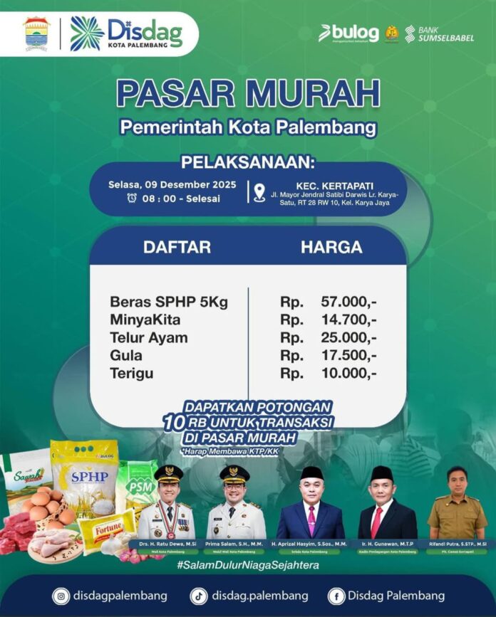 Sumsel.WartaDaerah.com. Palembang – Masyarakat Kecamatan Kertapati menyambut antusias pelaksanaan Pasar Murah yang digelar Pemerintah Kota Palembang pada Selasa, 09 Desember 2025, mulai pukul 08.00 WIB hingga selesai. Kegiatan ini berlokasi di Jl. Mayor Jendral Satibi Darwis, Lorong Karya-Satu RT 28 RW 10, Kelurahan Karya Jaya.
